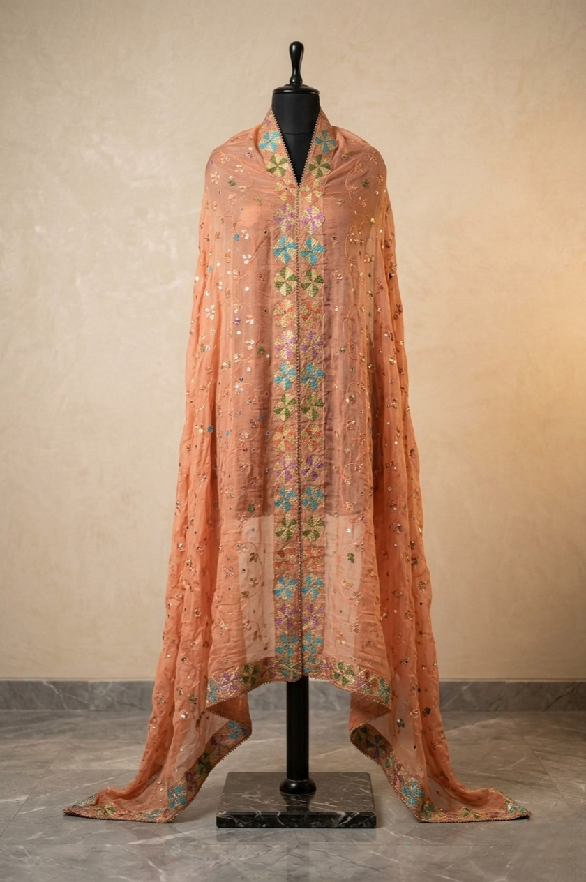 The warm peach hue combined with multicolored threadwork creates a refreshing and elegant look, making it easy to pair with a variety of outfits. Whether styled with a traditional suit or a contemporary fusion outfit, this dupatta brings effortless charm and sophistication to your wardrobe.