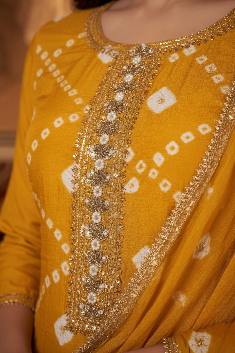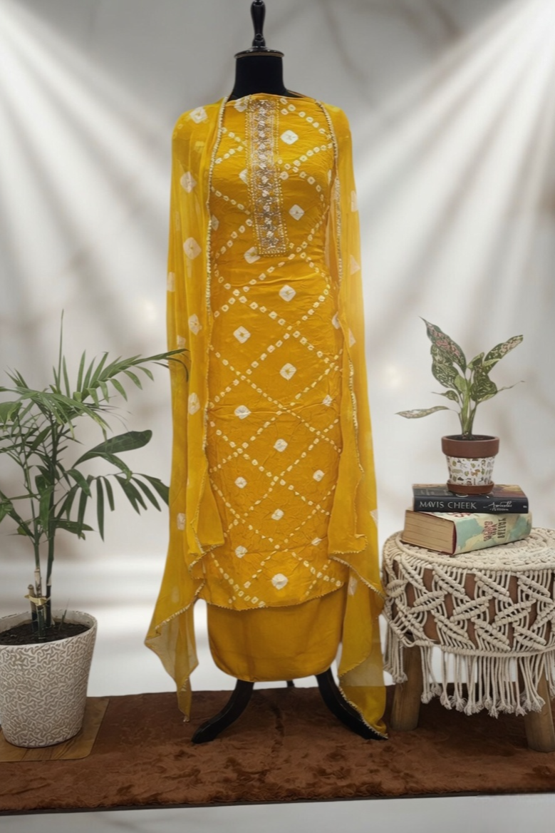 Yellow Bandhani Unstitched Suit Set with Hand Embroidery & Dupatta