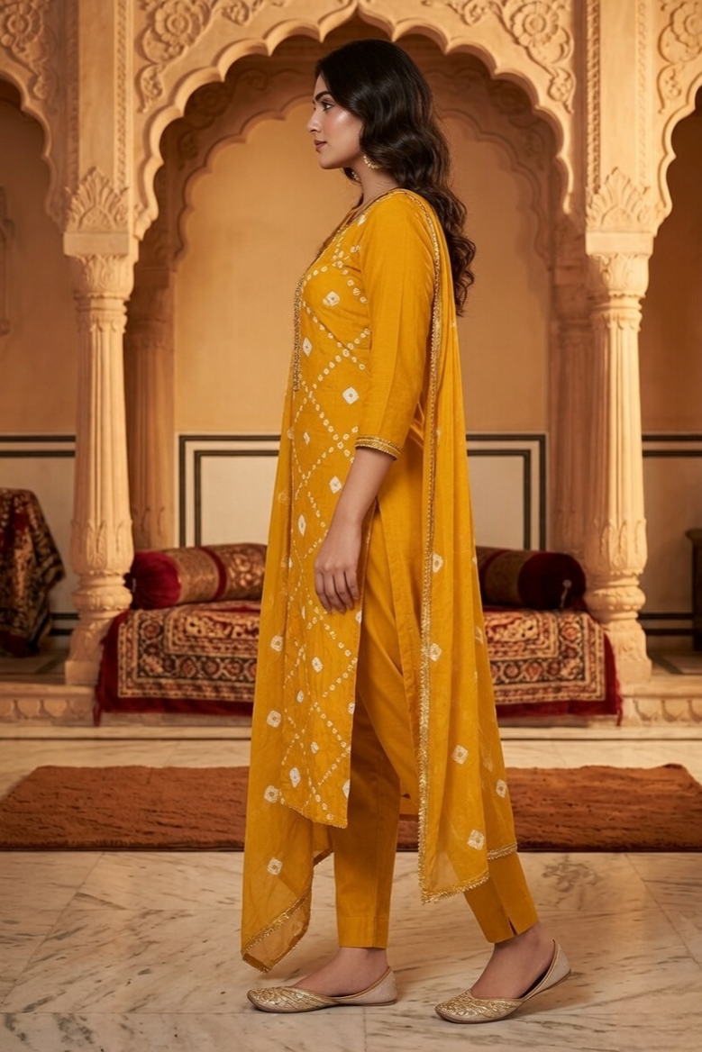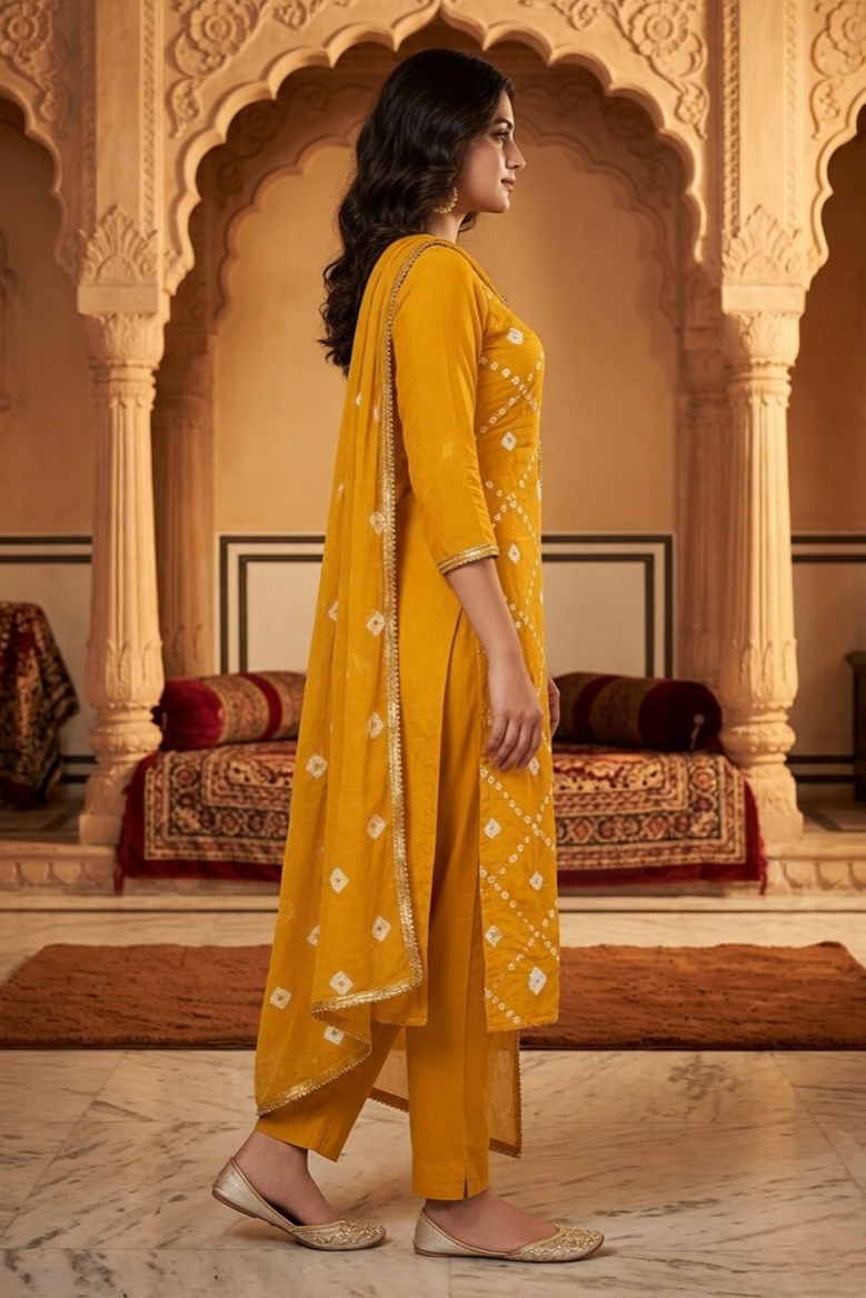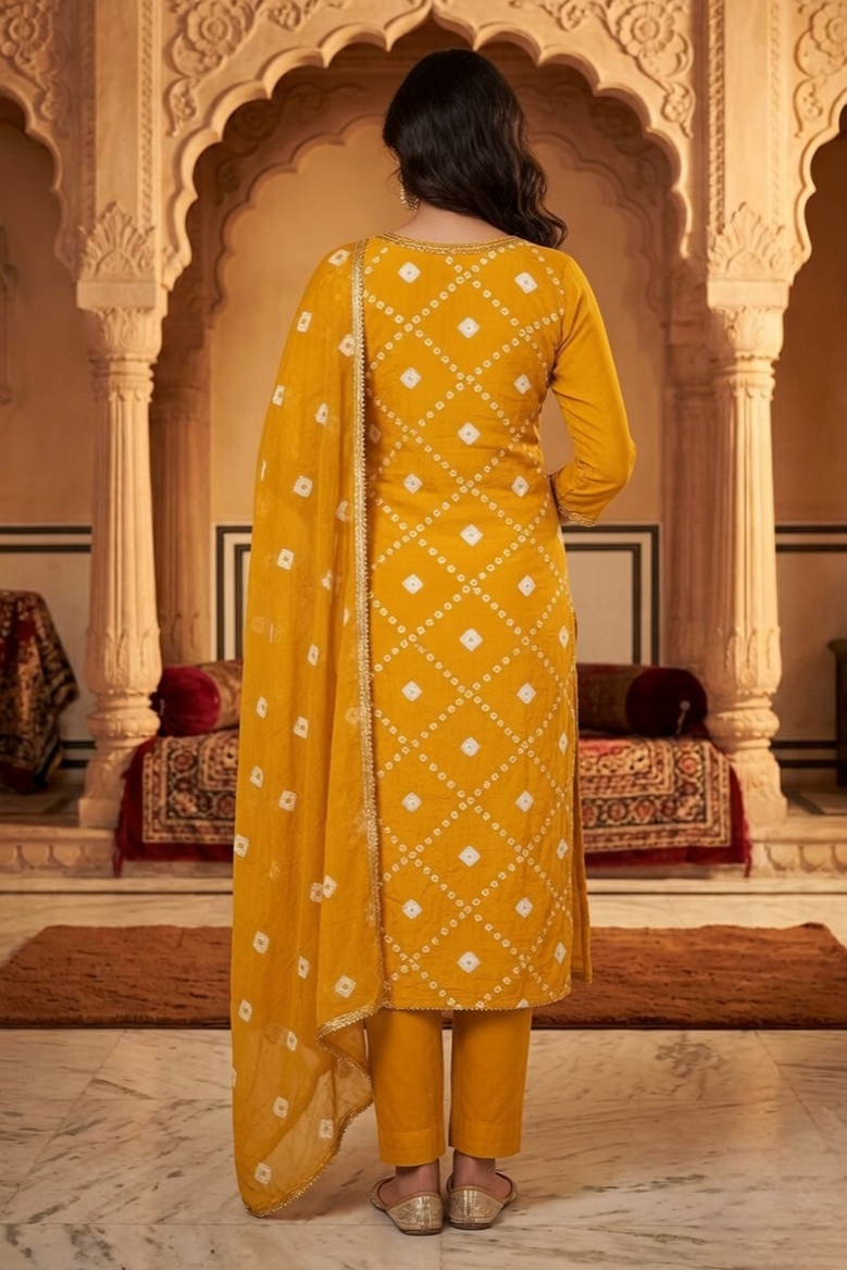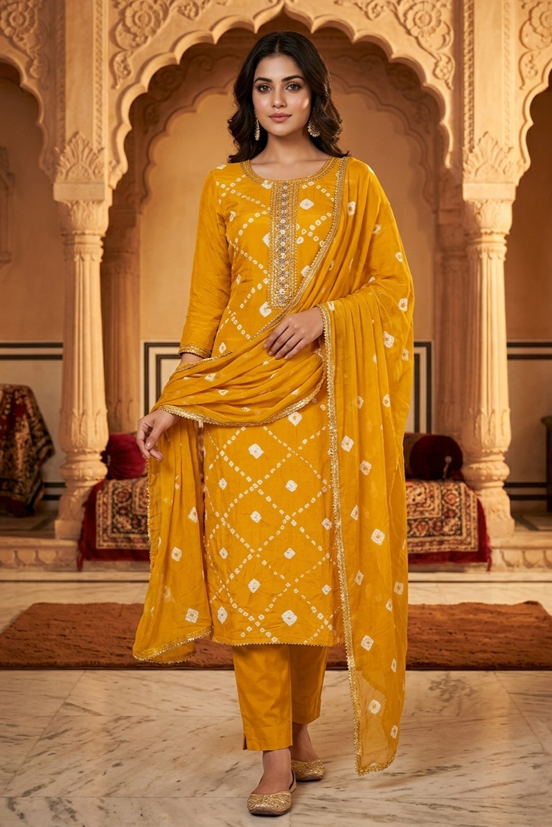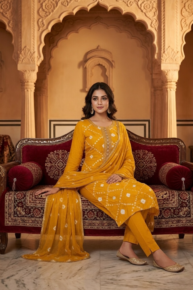 Infuse your ethnic collection with a radiant glow with this stunning Yellow Bandhani Unstitched Suit. A masterful celebration of traditional tie-dye artistry and contemporary refinement, this ensemble is designed for the woman who seeks timeless elegance with a modern edge.